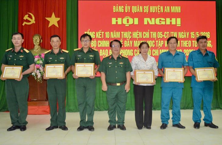 Qua hơn 10 năm triển khai thực hiện Chỉ thị số 05-CT/TW của Bộ Chính trị, huyện An Minh có 6 điển hình được Ban Thường vụ Tỉnh ủy tặng bằng khen, 18 điển hình được Chủ tịch Ủy ban nhân dân tỉnh tặng bằng khen, 10 điển hình được Ban Tuyên giáo Tỉnh ủy tặng giấy khen. Đồng thời, Ủy ban nhân dân huyện khen thưởng 142 tập thể, 171 cá nhân có thành tích tiêu biểu trong học tập và làm theo Bác; các chi, đảng bộ trực thuộc Huyện ủy đã biểu dương 815 lượt cá nhân tiêu biểu, điển hình trong học tập và làm theo Bác... Đặc biệt, huyện có 1 cá nhân được Thủ tướng Chính phủ tặng bằng khen, 1 tập thể được Ban Tuyên giáo Trung ương khen thưởng.